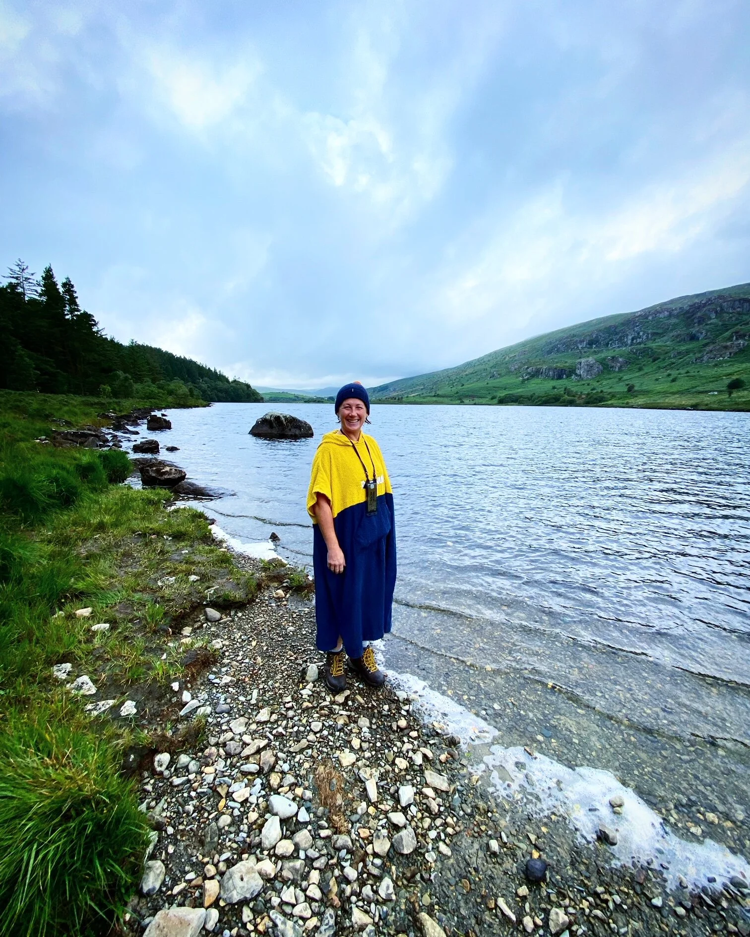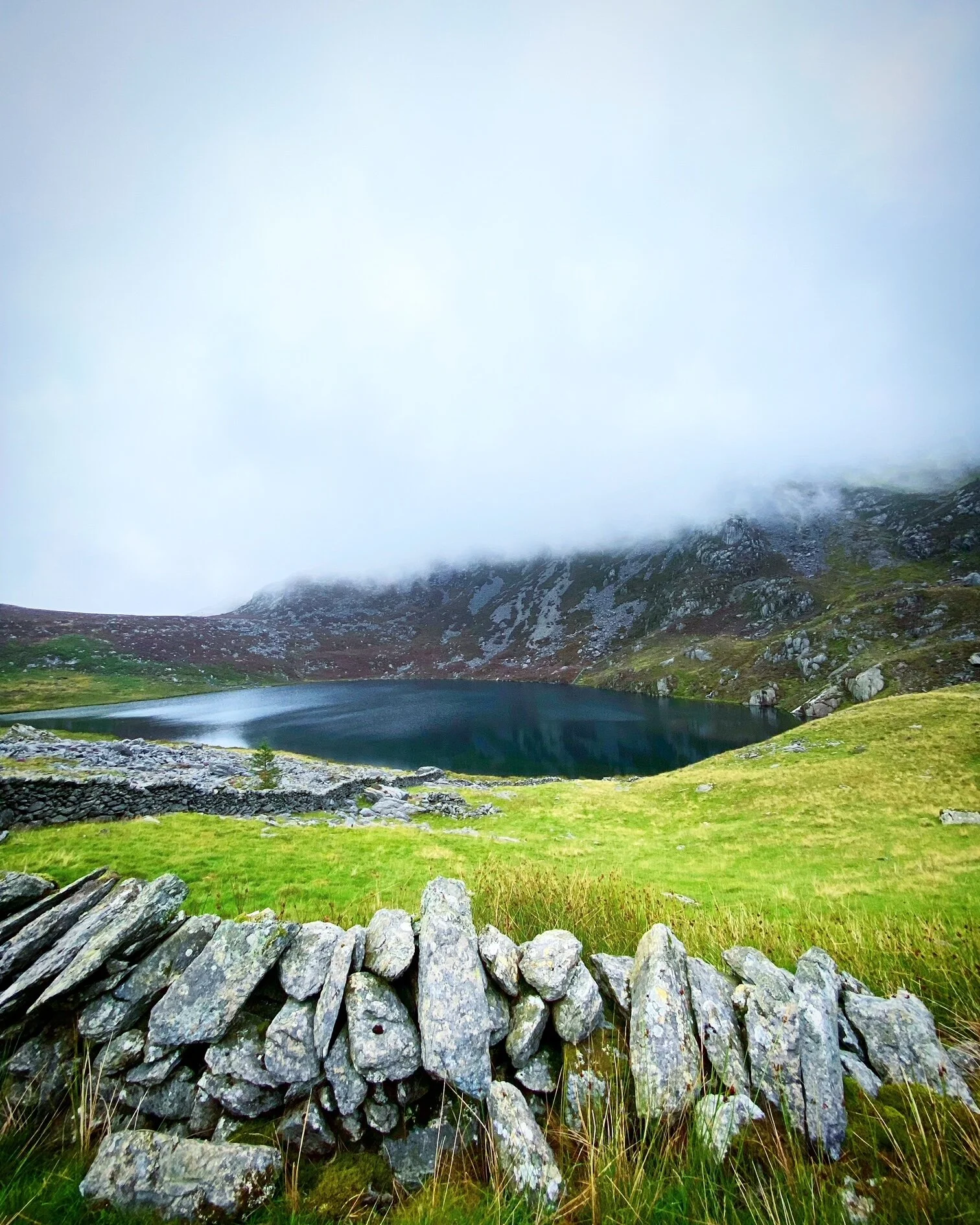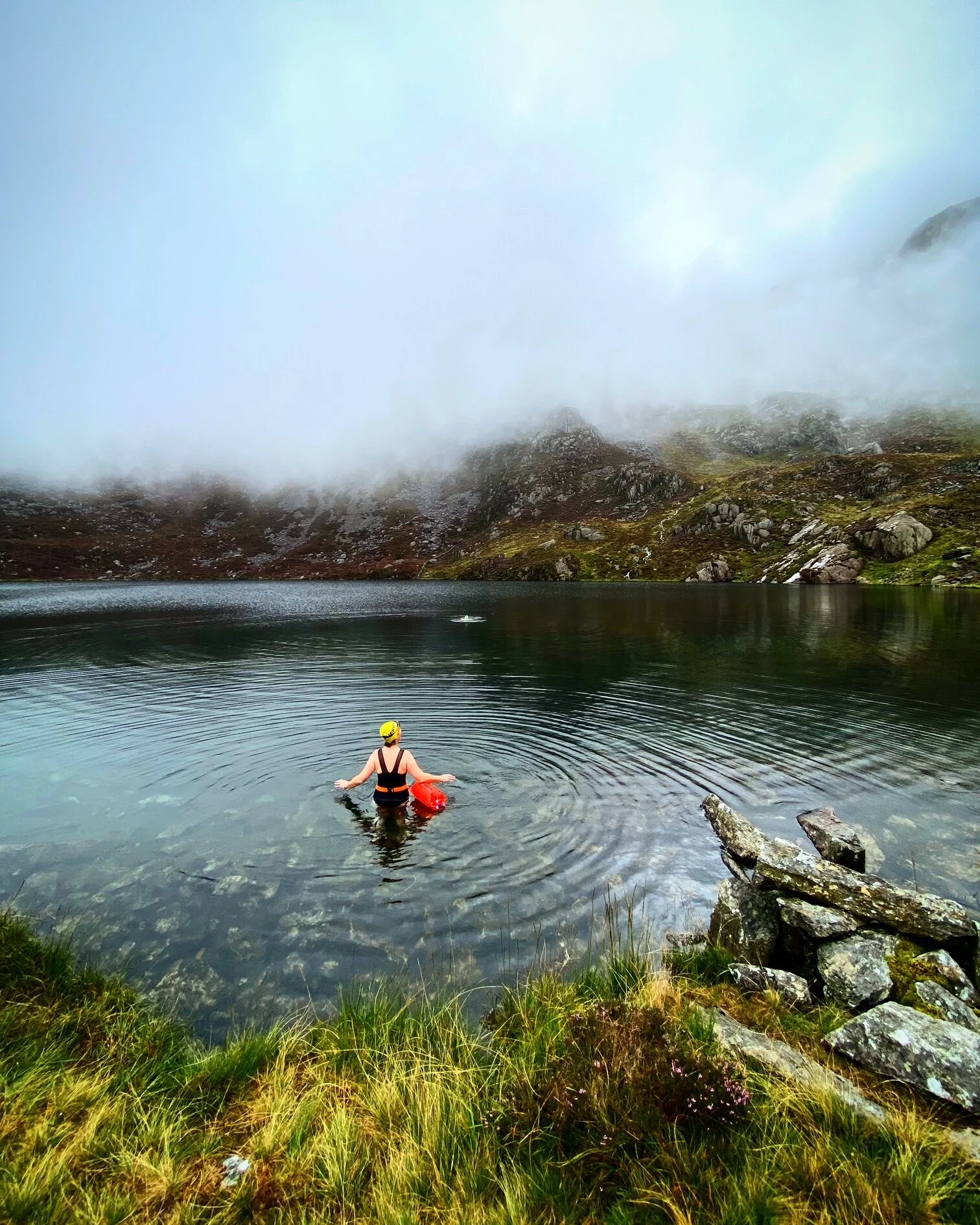 A hike to a bleak wild remote spot with a lake. The mist is hiding the craggy peak behind the water, the wind is creating waves on the surface, and I’m not feeling the love for this place. But again, before I can talk myself out of it, I find myself in the water, picking my steps gingerly over the sharp slippy stones then through a kind of reedy something; I’d rather not know what. Now I’m in the middle of a very large, black, deep Welsh lake (clinging to the rescue board like there’s no tomorrow) knowing I’ve got to get myself back to the shore under my own steam (knowing that Viv is never very far from me). I had invested in some swimming gear and one item which had yet to be tested was a tow float. I can report that it was an absolute game-changer for me. Knowing that I could just pause and yet still be safe was enough for me.